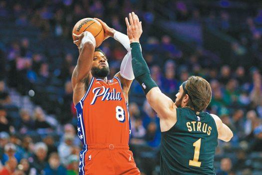 對陣騎士的比賽中,76人球員喬治迎著防守投射。路透社