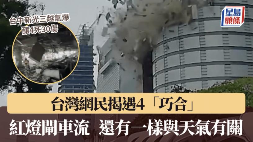 台中新光三越百貨公司周四 (13日)上午發生氣體爆炸,釀成4死約30輕重傷,震驚中港台。有當地網民表示,幸好事故發生時遇到四項巧合,包括事發時間在路面非繁忙的時間,以及踫巧上面路段遇上紅燈,減少涉事受災路段的車流量,否則死傷更為慘重。