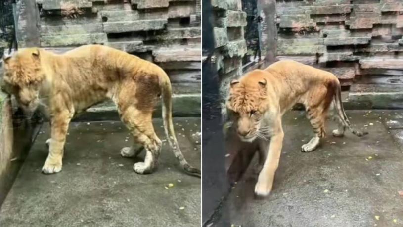 據上游新聞報道,汪女士11日發放一條拍於寧波野生動物園的影片,顯示有一隻瘦骨嶙峋的獅虎獸沒精打采在籠內慢步,獅虎獸走路時可見,牠弓著背、下腹部有凹陷感,後肢更瘦至皮包骨。