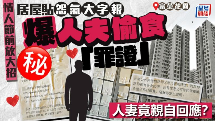 感情中的嫉妒如火把燃燒理智,往往在炙熱無聲下有衝動的驚人之舉。位於大角咀海庭道的居屋富榮花園,便有人夫早前疑被貼大字報大爆偷食「罪證」,而事件最抓狂之處,竟還惹出疑似人妻親自回應……
