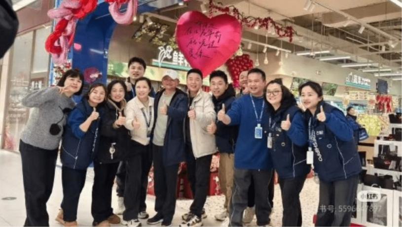 馬雲(戴白帽者)與盒馬鮮生員工合照留念。(網上圖片)