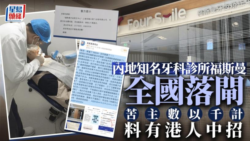 港人北上整牙成風。近日內地知名連鎖牙科診所福斯曼疑出現資金鏈斷問題,全國多家診所關門失聯,福田崗夏的門診也閉店,估計也有港人中招。全國的苦主估計數以千計,有患者不滿,診所「走佬」前仍收取高額矯齒費用。福斯曼創辦人徐志岩昨聲稱,資金缺口和患者處理問題「還有幾天就解決」。