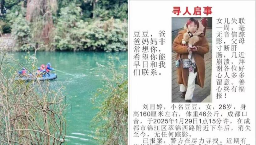 成都一名28歲女子劉某婷在除夕(1月28日)當天離家出走後失蹤。家人和警方多方尋找未果,她的鞋子及衣物在岸邊及河道內被發現。截至2月15日,她已失蹤19天。當天下午,一位釣魚者在河中發現了她的屍體,警方隨後確認了這一消息,家屬悲痛萬分。