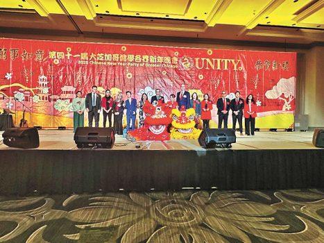 第41屆大芝加哥地區僑學各界新年晚會15日在希爾頓酒店盛大舉行。總幹事胡玲玲(左6)、類延峰處長(左7)、中華會館主席項邦珍(右7)與主流政要向嘉賓們拜年致意。 梁敏育攝