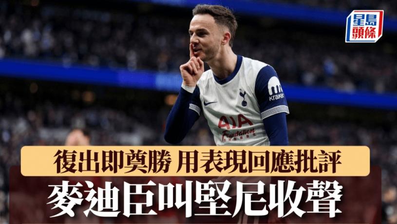 曼聯名宿堅尼日前曾公開批熱刺球星占士麥迪臣並非能帶領球隊重返正軌之人,然而此子養傷一個月後復出即於周日英超一箭定江山,助熱刺主場1:0擊敗曼聯,而麥迪臣慶祝入球時就做出閉嘴的手勢,賽後又明言用場上表現回應質疑,矛頭直指堅尼。