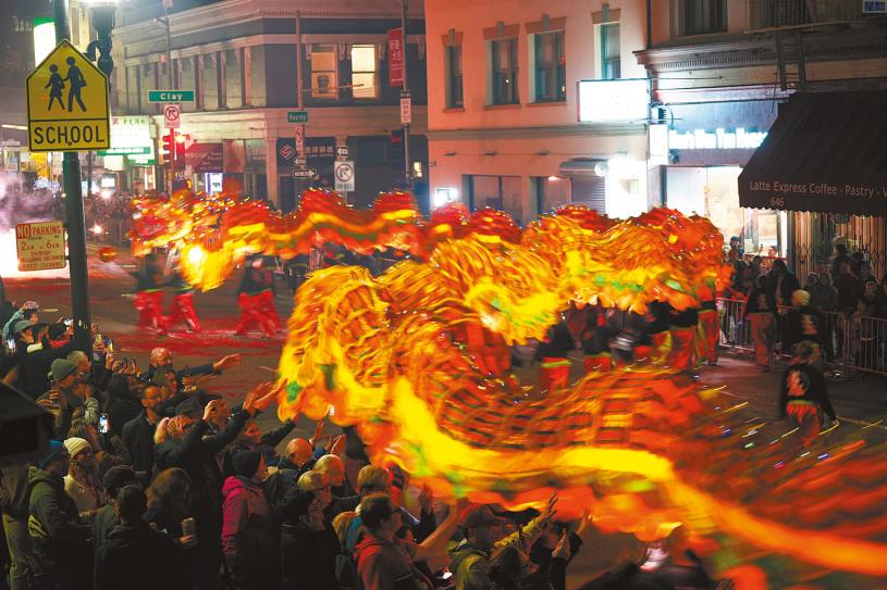 三藩市華星藝術團將以令人興奮的中國傳統舞蹈和音樂表演讓觀眾著迷;管樂儀仗隊奏起嘹亮的軍樂,精神抖擻踏著整齊的步伐;少林拳、跆拳道等武林高手,刀光劍影,威風凜凜;最新出爐的全美華埠小姐亭亭玉立的站在花車上,向圍觀民眾招手致意;媽祖繞境慶典,黑白無常打著肅靜、迴避的招牌招搖過市;數十頭醒獅奔跑跳躍,吞雲吐霧的百尺金龍狂舞;在重點站,嘉賓們一起點燃10萬頭紅衣轟天大爆竹炸響,並在唐人街中心壓軸點燃金龍飛舞。