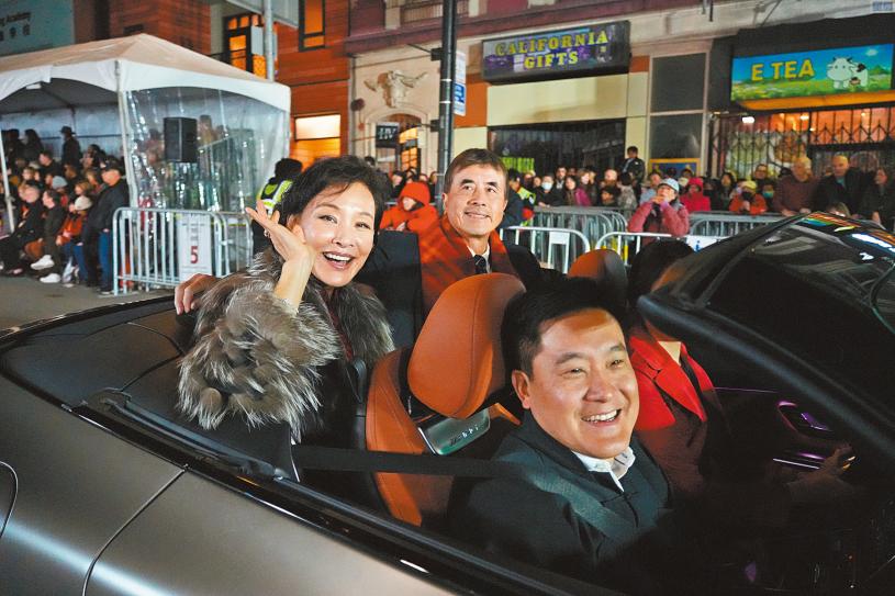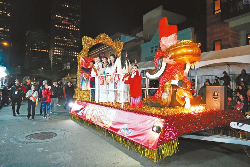 傍晚5時許,10多輛鐵騎警隊開路,擔任蛇年花車巡遊總指揮的荷里活紅星陳沖,和擔任榮譽總指揮的三藩市市長羅偉,與浩浩蕩蕩的巡遊隊,穿越160年前的歷史與當下,向夾道歡呼的民眾拜年。陳沖點燃慶典鞭炮,揭開盛大遊行序幕。