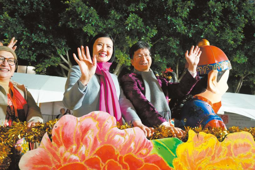 中領館總領事張建敏偕夫人鄭心在花車上向市民揮手致意。記者黃偉江攝