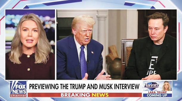 白宮發言人萊維特(左)澄清馬斯克在政府效率部中的角色,稱這位科技億萬富翁不是政府的僱員,也沒有實際或正式的權力做出政府決策。 電視截圖