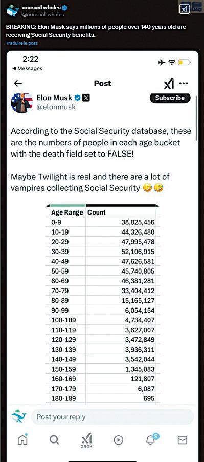 綜合霍士新聞及《紐約郵報》報道,馬斯克16日晚在X發文,批評社安局數據庫不同年齡層的死亡資料都有錯誤,並在留言中附上圖表,顯示社安號持有人的年齡介乎0歲至369歲之間,其中130至139歲的有390萬人,140至149歲有350萬人,還有一人在360到369歲之間。馬斯克嘲諷說,由此可見科幻小說《暮光之城》(Twilight)的故事確實存在,「很多吸血鬼在領取社安金」,而且「合資格」人數遠遠超出公民數字,可能是史上最大規模的欺詐。