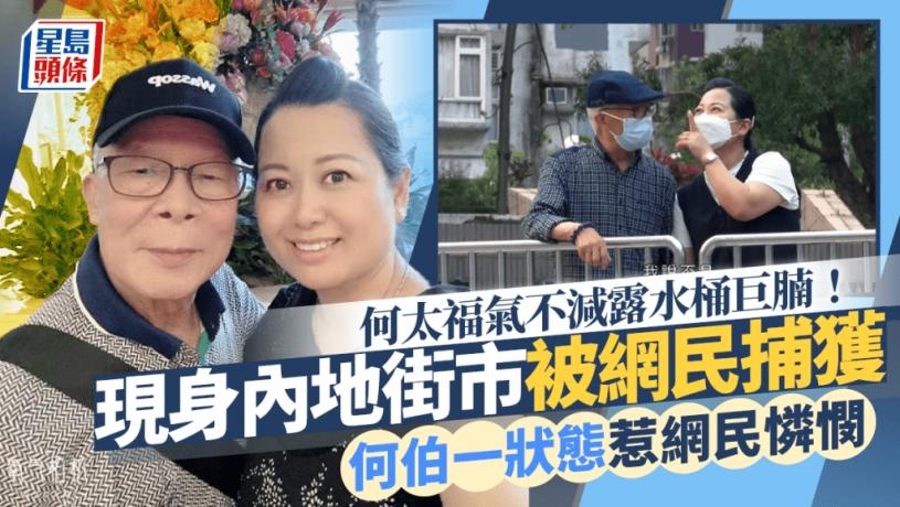 年近80歲的何伯與自稱比老公細30年的何太一段忘年戀及父女金錢糾紛成為熱話,去年更獲選為Google搜尋十大話題人物之一。何太形象飄忽,一時扮嬌妻一時扮惡妻,對何伯態度兩極,她曾怒轟何伯「你七街瞓」更成為經典。沉寂一時的何伯夫婦,近日被網民在內地街市捕獲,兩人依然恩愛,何太福氣不減,挺巨腩孭A貨Gucci手袋,親民與女網民合照。