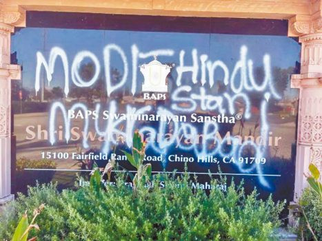 位於奇諾崗的印度廟「BAPS Shri Swaminarayan Mandir」大理石標誌、磚牆和城市人行道上遭人塗鴉破壞,內容提及印度總理和北方邦西部城市等。