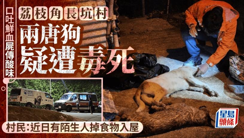 荔枝角長坑村內,今日(3月17日)晚上7時許有兩狗嘔血,懷疑遭人下毒。警員接報到場,證實兩狗已經死亡,愛護動物協會人員亦到場協助,未有發現兩狗有外傷,其死因仍待調查。