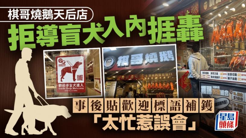 人氣燒味餐廳「棋哥燒鵝」天后分店被指於本周一(17日)拒絕讓食客帶同導盲犬入內,公然歧視,事件在網上發酵惹來熱議。至今早(19日)棋哥燒鵝已在餐廳張貼告示,表明歡迎導盲犬,並在社交平台發聲明,直指對事件深感歉意,會確保類似情況不再發生。涉事的天后分店有女職員親述當日情況,聲稱是因為工作太忙,以致招待不足,強調是誤會一場,店方歡迎導盲犬進入。