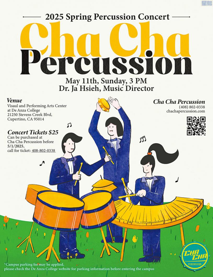 南灣「恰恰打擊樂」將於2025年5月11日星期日母親節當天下午三點於南灣古柏蒂奴(Cupertino)De Anza College Visual and Performing Arts Center舉辦「恰恰打擊樂2025春季音樂會」,演出木琴、鐵琴、爵士鼓、定音鼓和拉丁手鼓等豐富多樣的打擊樂器聲響。