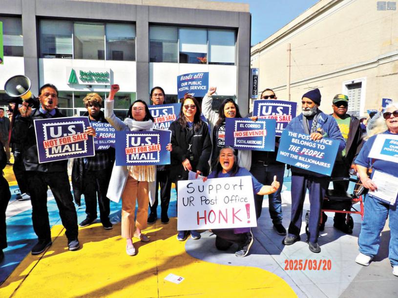 美國郵政工人工會(APWU)三藩市分會聯同社區盟友,周四(20日)在Fox Plaza郵局前集會,高舉「美國郵政不是商品」標語,抗議特朗普政府計劃將美國郵政服務(USPS)轉移至商務部,甚至拆分或出售的可能性。郵政工人警告,這一計劃將導致郵費飆升、服務縮減,甚至關閉部分社區郵局,嚴重影響公眾利益。