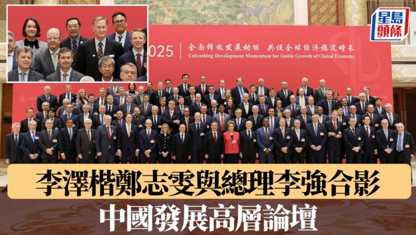 中新社和外電發佈的總理李強與參會者的大合影,李澤楷與鄭志雯、查懋德等站在最後一排。