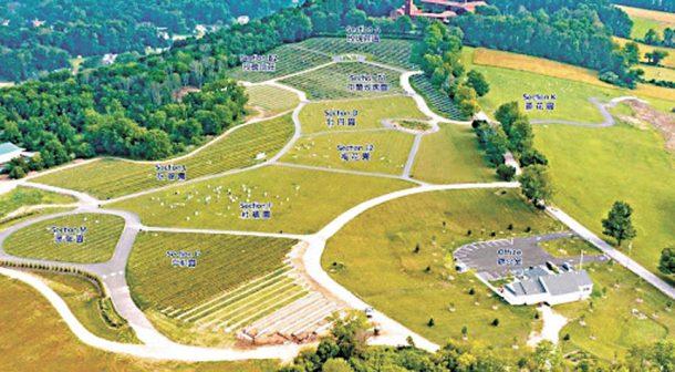 恆福陵園全景圖,展示不同方位朝向的中文園區。