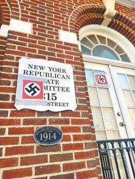 共和黨位於奧本尼(Albany)的紐約州總部門窗,被人惡意貼上納粹標誌圖案(swastika)。共和黨和警方批評,這是卑鄙的政治仇恨行為。