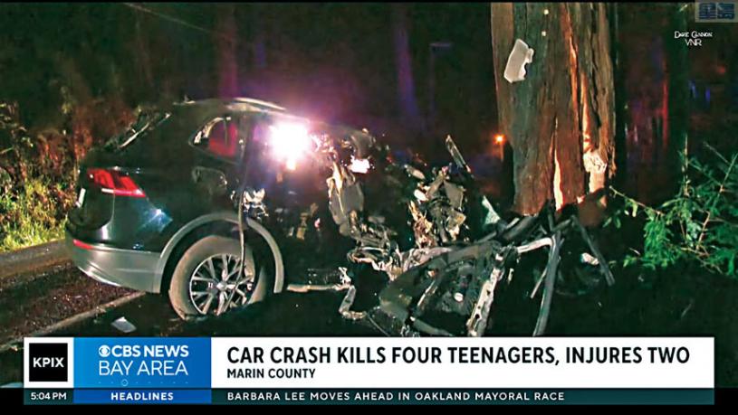 北灣麥林縣(Marin)日前發生重大車禍,一輛休旅車(SUV)撞上一棵樹,車上4名高中生慘死,另外2人情況危急,肇因尚待當局調查。