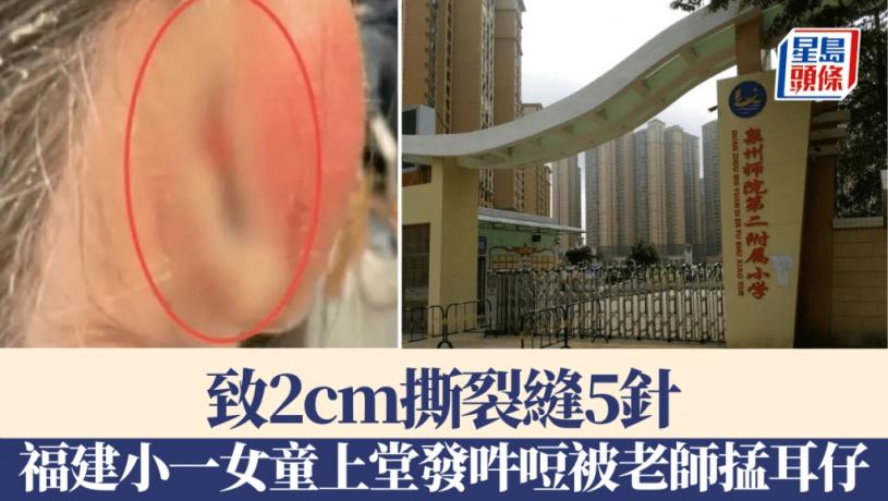 有網友爆料稱,4月22日,福建泉州師範學院第二附屬小學一名小一女生因上課發呆未專注聽課,被老師擰傷耳朵,右側耳廓耳後溝裂傷2CM。事後家長带學生至醫院縫合5針。