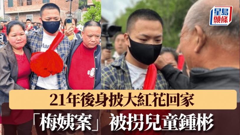 「梅姨案」被拐兒童鍾彬21年後身披大紅花回家。