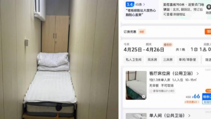 據上游新聞報道,24日有網民發帖,指在北京經訂房平台,以95元人民幣預訂了一家快捷公寓單人間,實際入住時卻發現房間狹窄逼仄,面積不足5平方米,床鋪緊貼牆面,兩側幾無空隙。