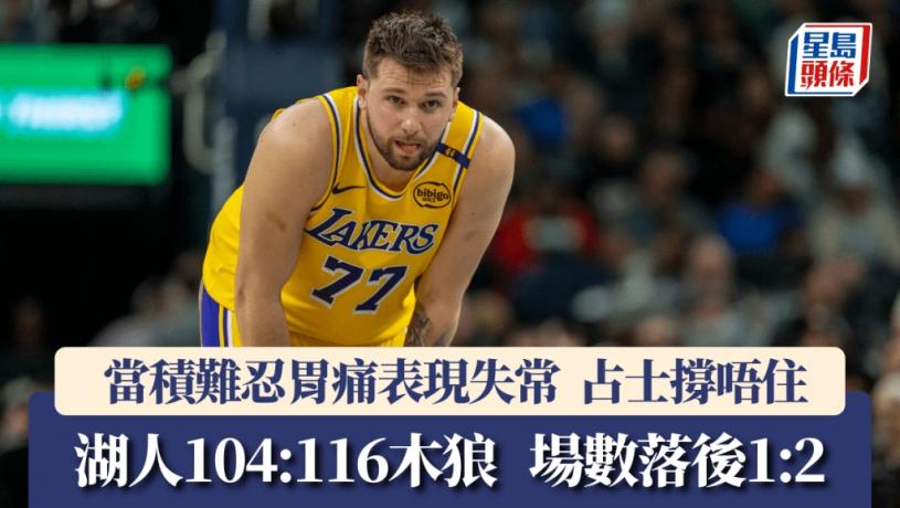 NBA季後賽西岸首圈第3戰,洛杉磯湖人作客明尼蘇達木狼,在星將當積因胃痛表現失準,全場僅得17分下,就算有另一巨頭勒邦占士苦撐轟下38分也好,湖人仍然以104:116敗陣,總場數落後1:2。
