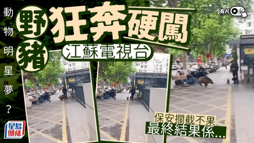 周日(27日)下午,內地網絡熱傳一段野豬闖入江蘇電視台的影片。片中看到,野豬正門衝入電視台,保安攔截失敗,野豬跑入草叢。