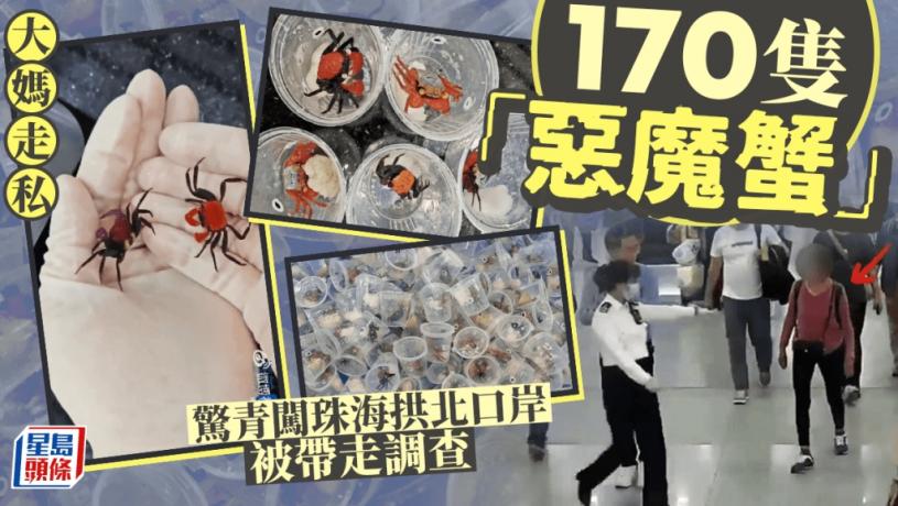 一名內地旅客4月9日欲從珠海拱北口岸返回內地,經過旅客檢驗大廳時,在場的海關人員發現其眼神「飄忽不定」,行為可疑,於是將其攔下檢查隨身行李,竟發現她揹了170隻活體「惡魔蟹」(又名吸血鬼蟹)欲走私入境,遂將其帶走調查追責。