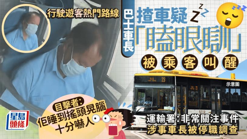 有網民昨日(28日)搭乘大嶼山23號路線的巴士,發現車長竟然全程疑「瞌眼瞓」,頻頻閉目「釣魚」多次險「瞓著」,該目擊網民指該巴士車長「只一兩分鐘清醒一下」,「睡到搖頭晃腦,十分嚇人」,為安全起見最後要「叫醒他」。