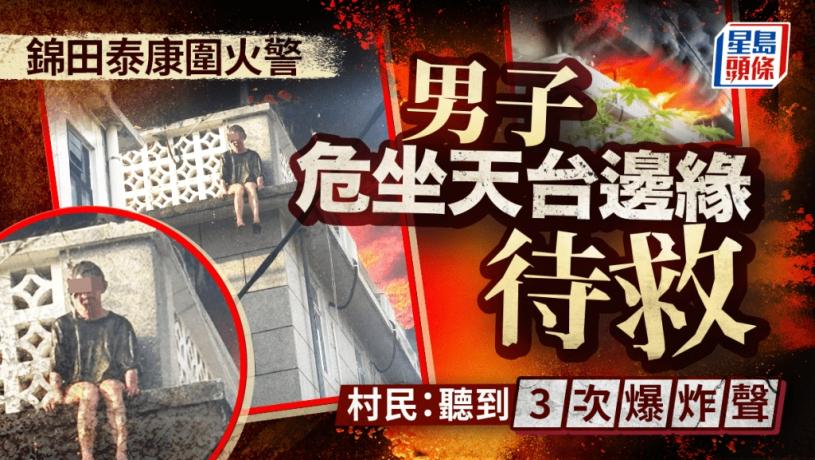 元朗錦田泰康圍一村屋天台於今晨(30日)失火,冒出滾滾黑濃並傳出爆炸聲,其間住戶走火警的驚險一幕曝光。有村民拍得片段所見,一名男子爬出頂樓的欄杆,坐在石壆邊緣等待救援,其身後單位已陷入一片火海,大火正逐漸逼近。幸消防員到場後,救出71歲姓黃男戶主,他燒傷臉部及手腳需要送院,最後大火在約40分鐘後被救熄。
