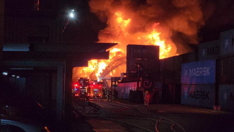 現場所見,貨櫃場內火勢猛烈,有濃煙升上半空。消防正向火場射水,消防輪亦趕赴現場灌救。