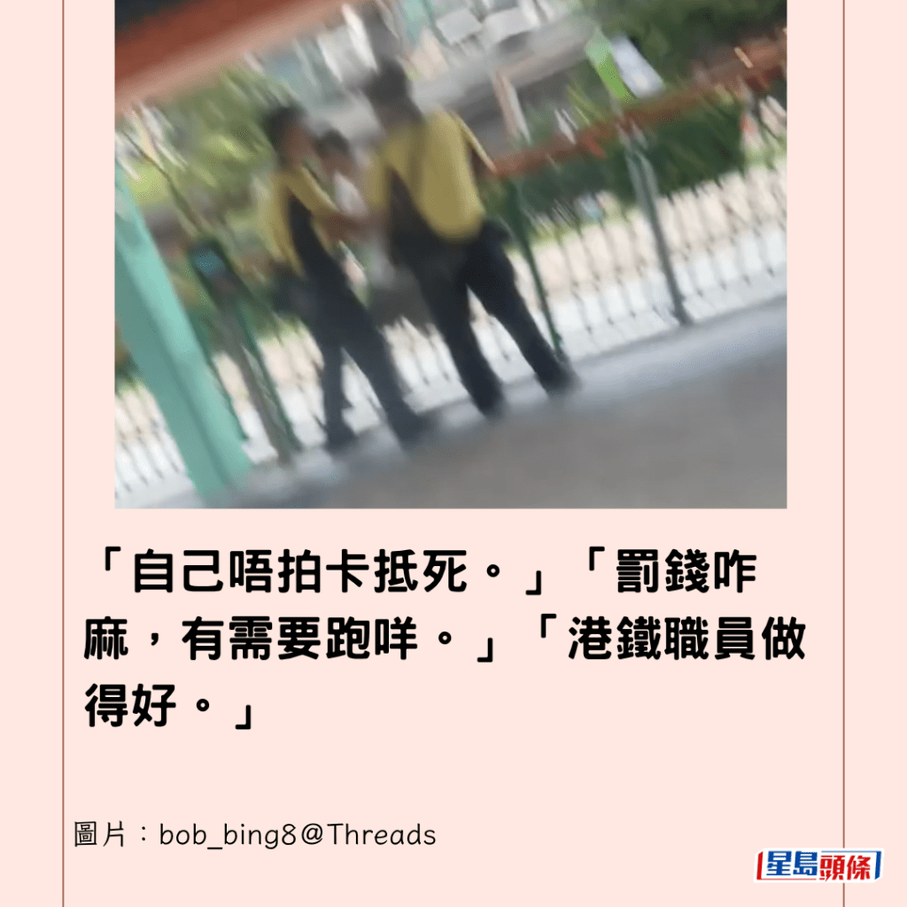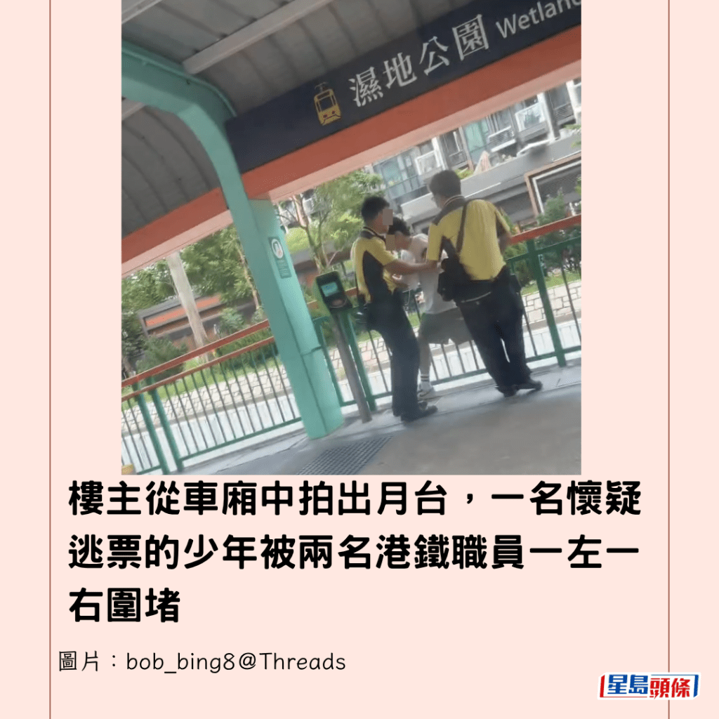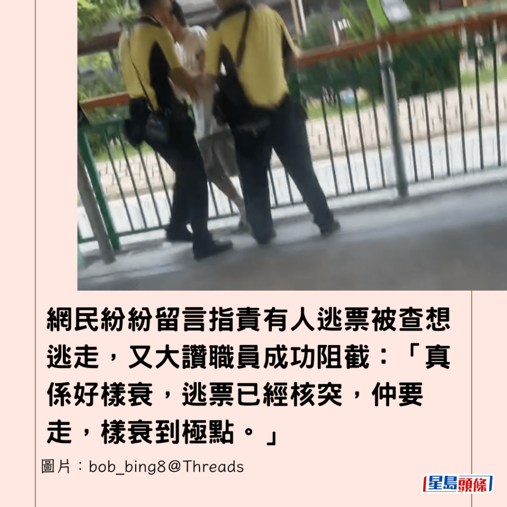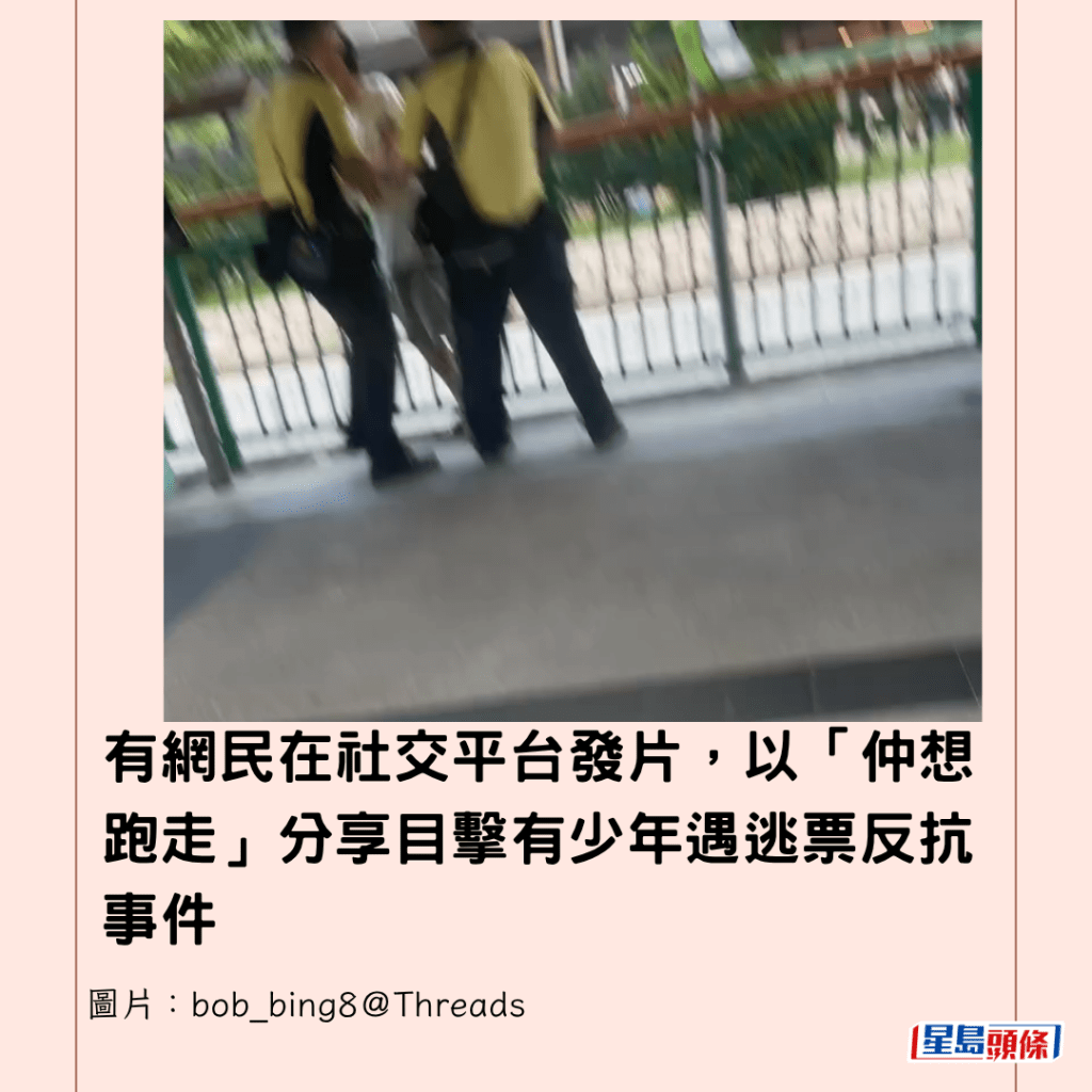 有網民昨日(7日)在社交平台發片,以「仲想跑走」分享目擊有少年遇逃票反抗事件,樓主從車廂中拍出月台,一名懷疑逃票的少年被兩名港鐵職員一左一右圍堵,少年突奮力欲推開一名職員突圍。