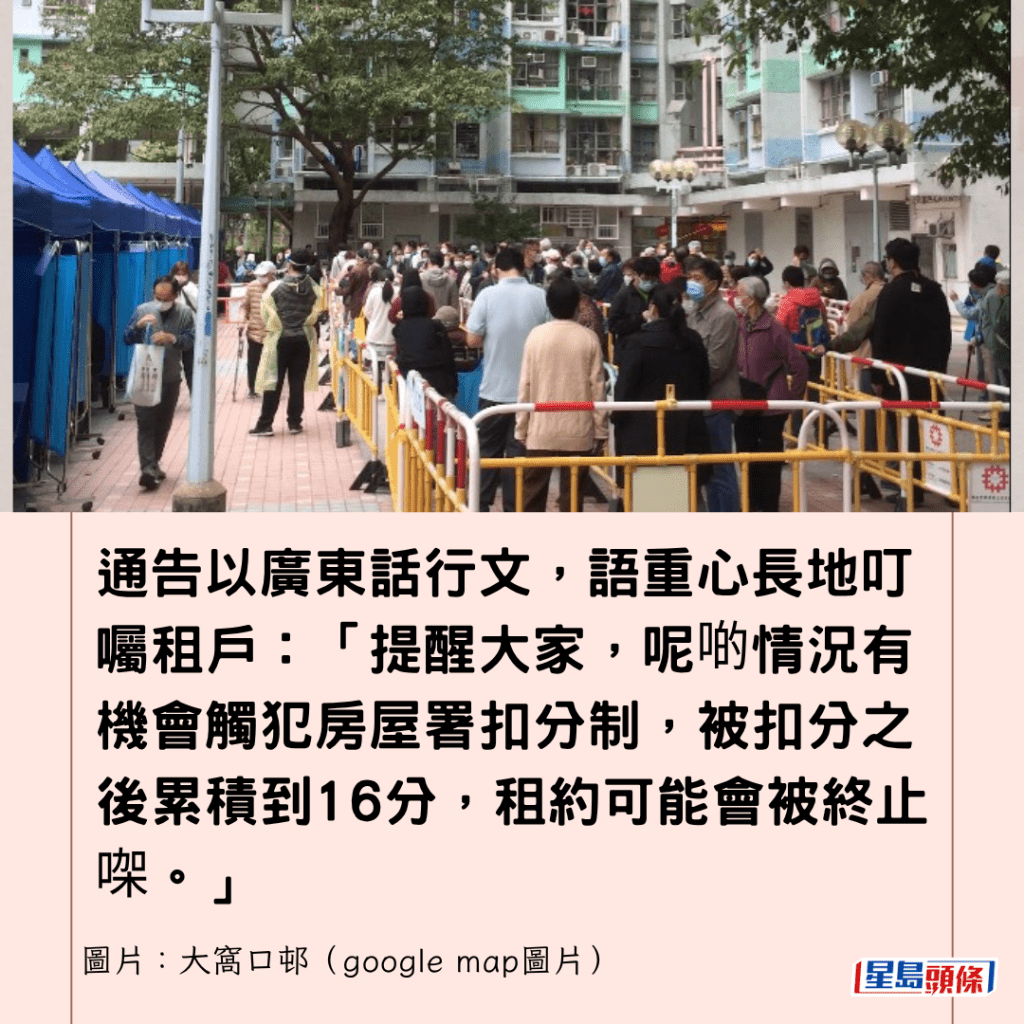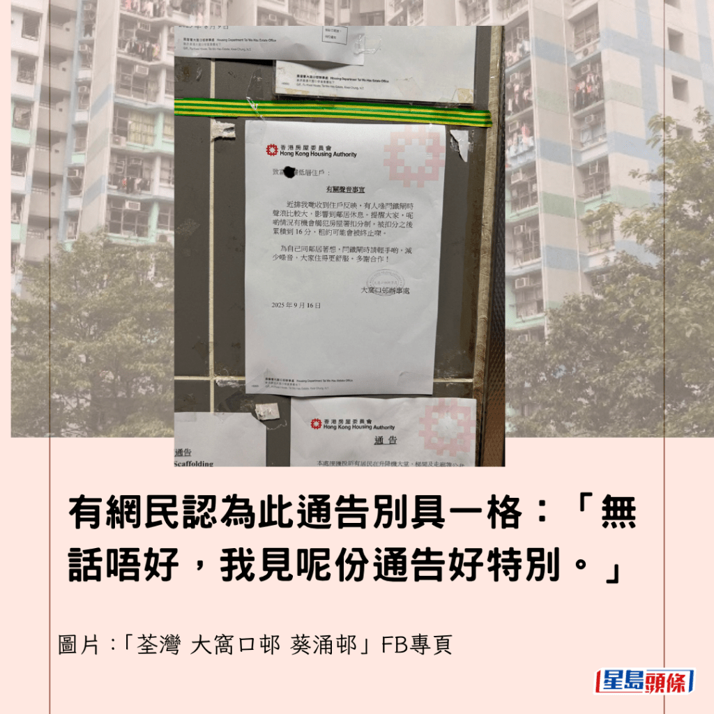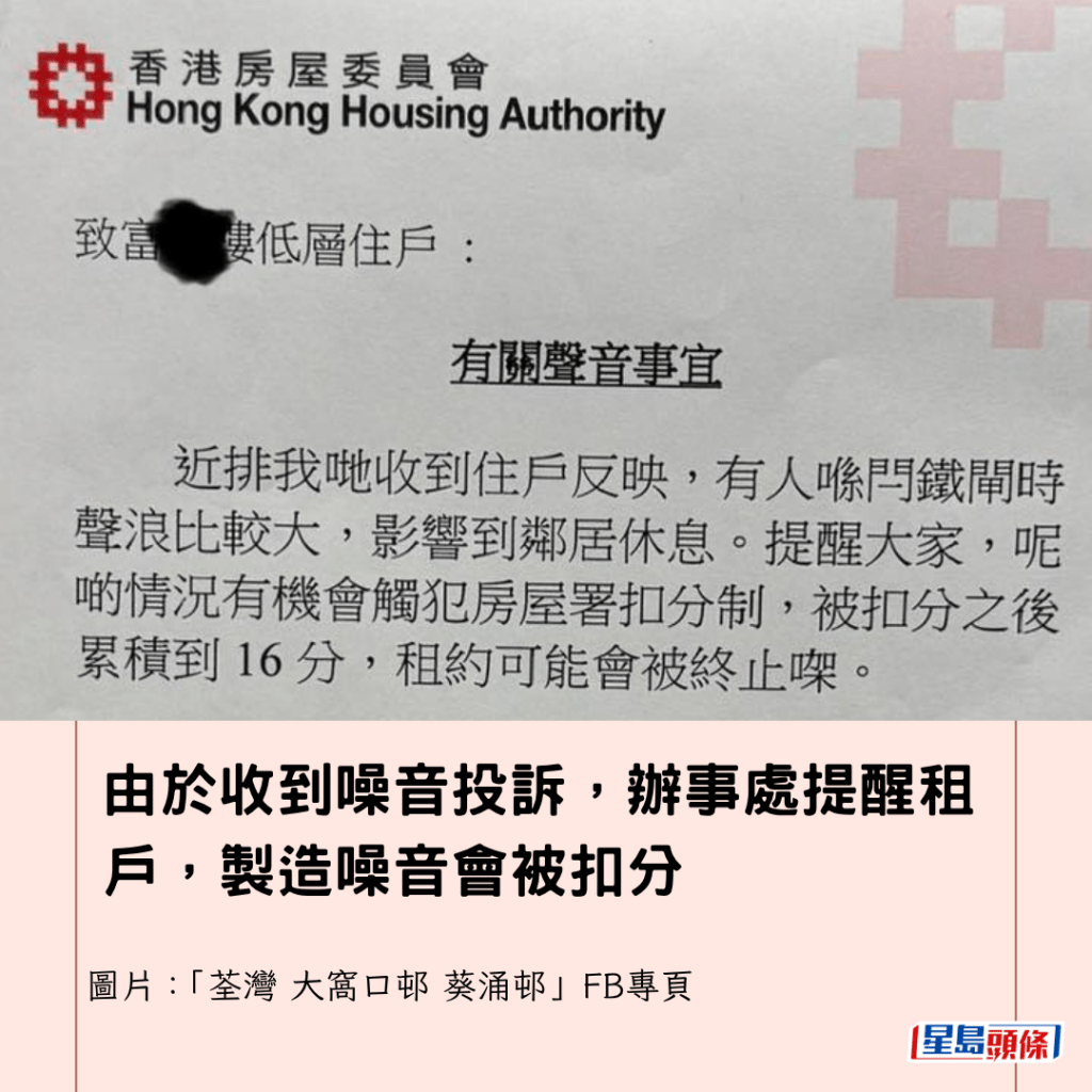 由於收到噪音投訴,辦事處提醒租戶,製造噪音會被扣分,通告以廣東話行文,語重心長地叮囑租戶:「提醒大家,呢啲情況有機會觸犯房屋署扣分制,被扣分之後累積到16分,租約可能會被終止㗎。」
