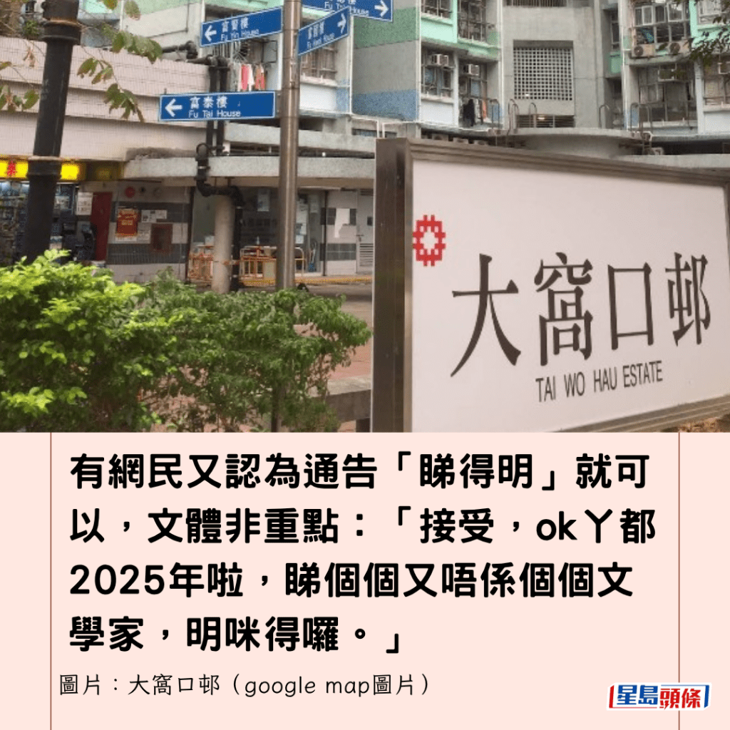 有網民又認為通告「睇得明」就可以,文體非重點:「接受,ok丫都2025年啦,睇個個又唔係個個文學家,明咪得囉。」