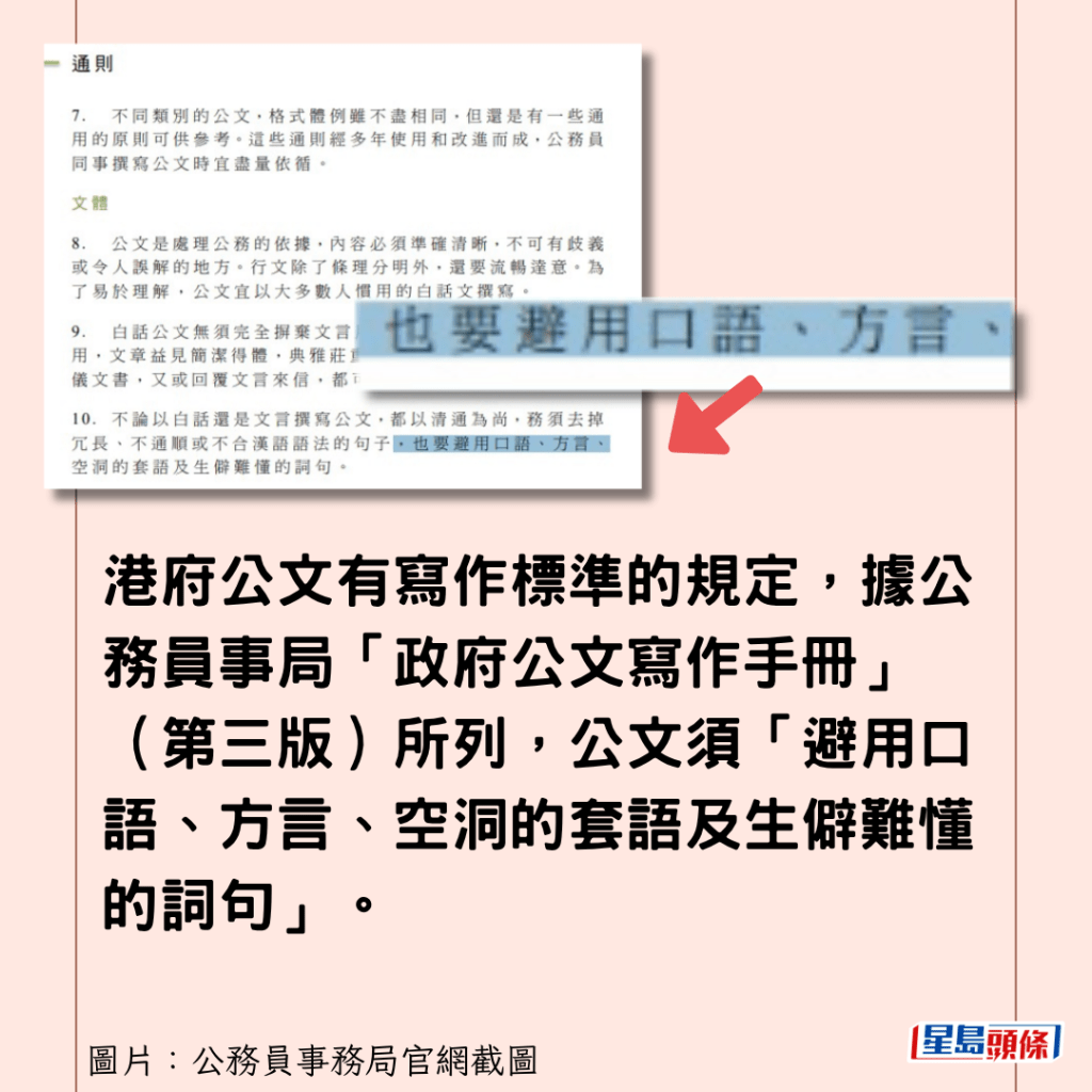 據公務員事務局「政府公文寫作手冊」建議,港府公文應「避用口語、方言」。