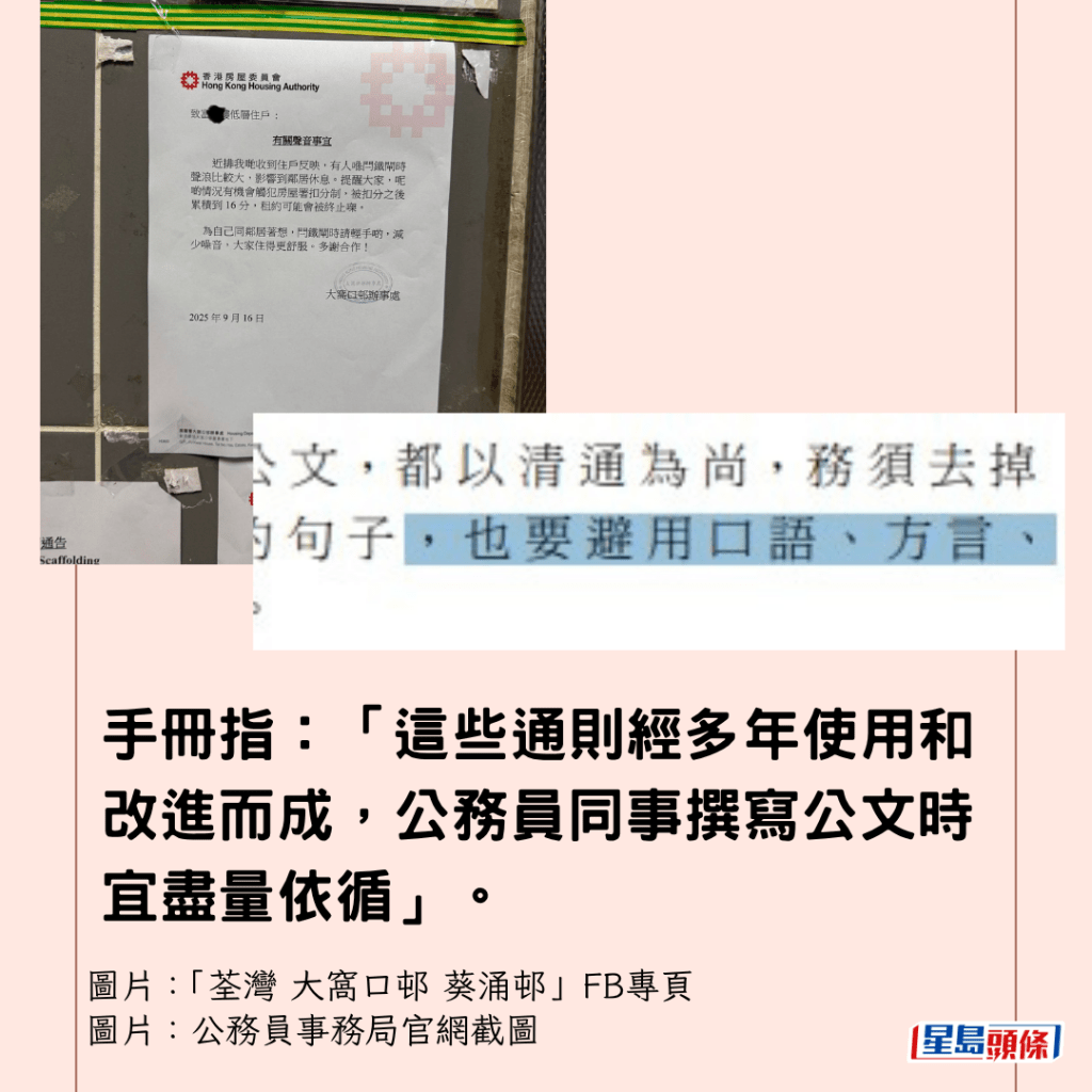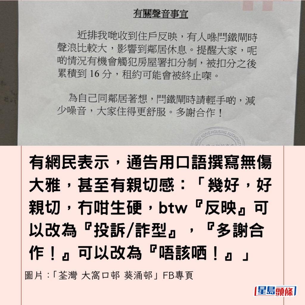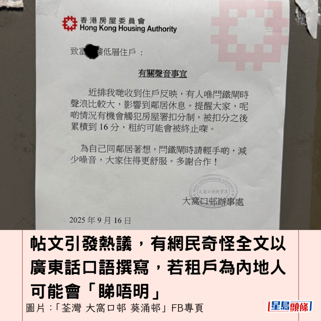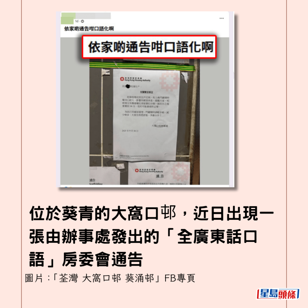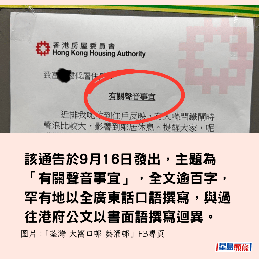 有網民在「荃灣 大窩口邨 葵涌邨」FB專頁發相分享一張房委會公屋通告,樓主在帖文表示:「依家啲通告咁口語化啊」,該通告於上月(9月)16日發出,主題為「有關聲音事宜」,全文逾百字,罕有地以全廣東話口語撰寫,與過往港府公文以書面語撰寫迴異。