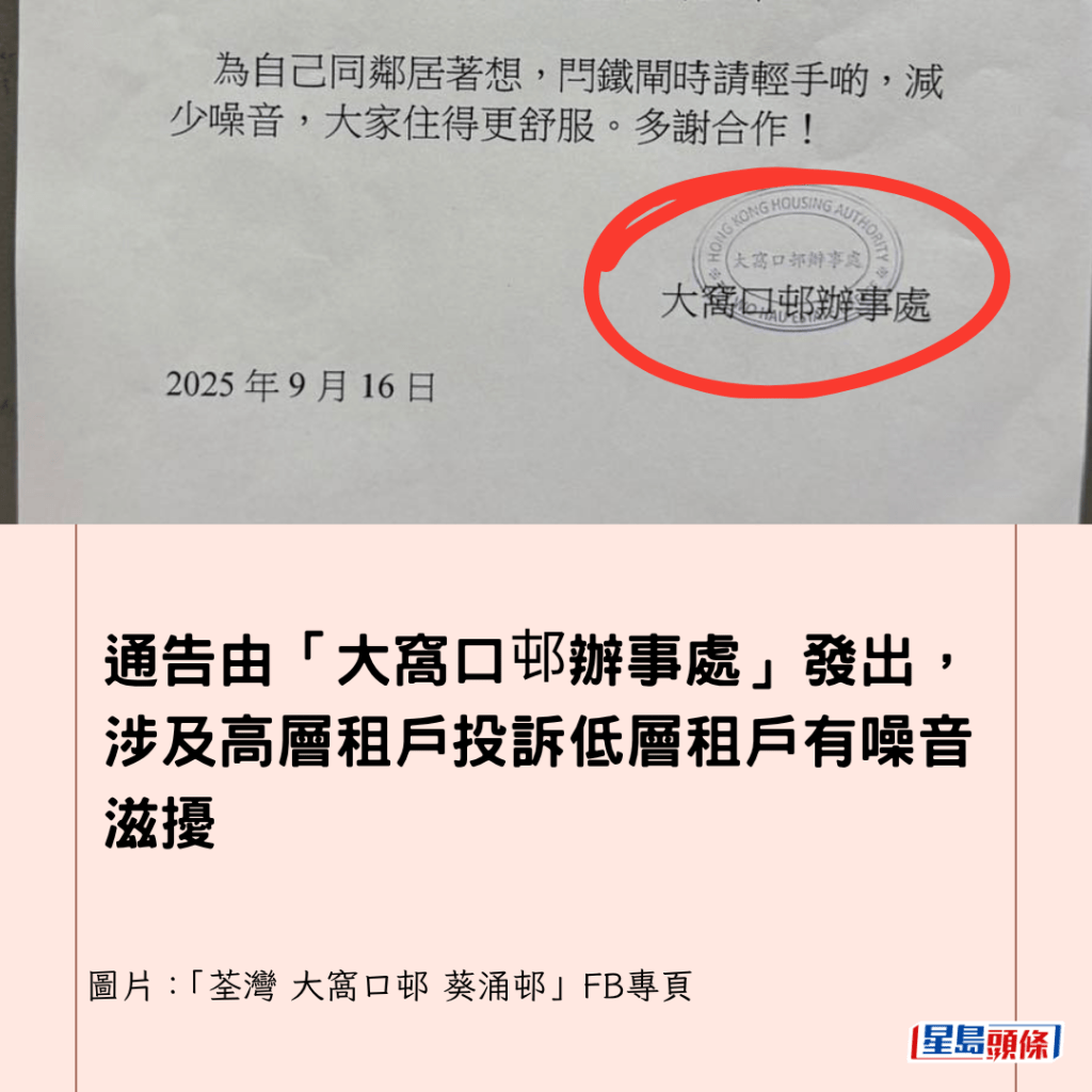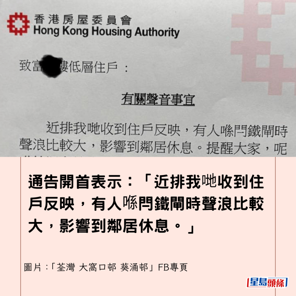 通告由「大窩口邨辦事處」發出,涉及高層租戶投訴低層租戶有噪音滋擾,通告開首表示:「近排我哋收到住戶反映,有人喺閂鐵閘時聲浪比較大,影響到鄰居休息。」