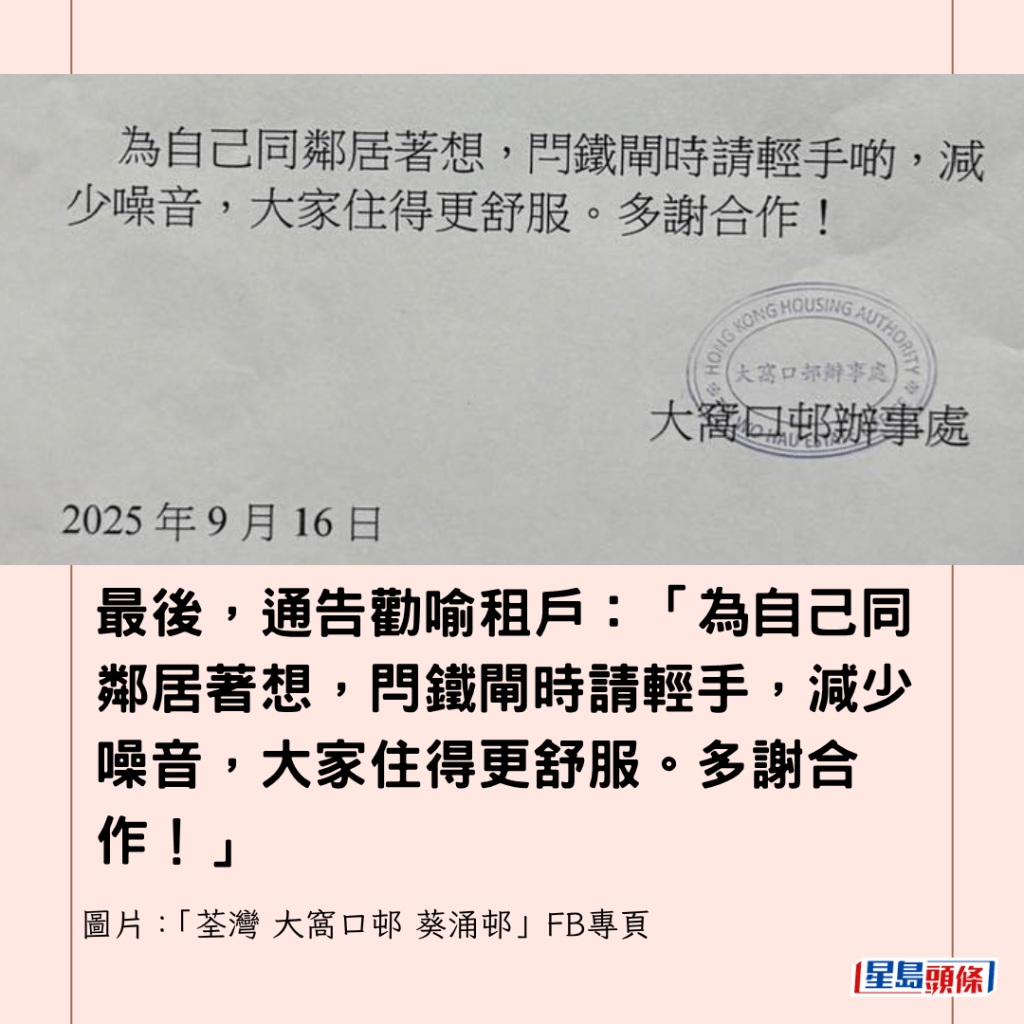 最後,通告勸喻租戶:「為自己同鄰居著想,閂鐵閘時請輕手,減少噪音,大家住得更舒服。多謝合作!」