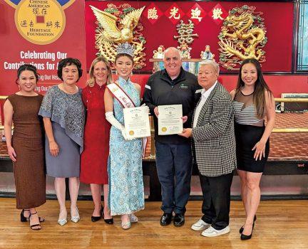 費連議員和墨菲議員給徐楚逍頒發市議會的嘉獎狀。他在致詞中表示,特別感謝美華傳統基金會會長李徐慕蓮女士及職員們的辛勞,讓社區再次凝聚在一起,共同慶祝這場屬於華人青年女性的榮耀時刻。他提到自己曾在美國海軍服役25年,與許多亞裔與華裔美國人並肩作戰,深深敬佩他們對國家的忠誠與奉獻精神。