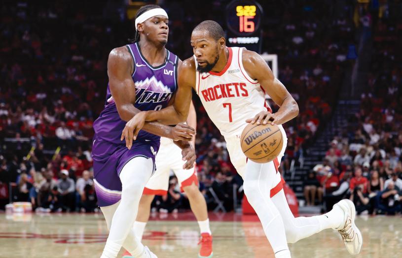 NBA季前賽,主場作戰的火箭9日以140:127擊敗爵士。全場比分(火箭隊在後):25:23、36:44、40:40、26:33。火箭的杜蘭特10中7,砍下20分。