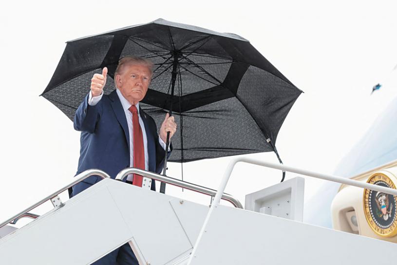 美國總統特朗普12日出發前往以色列。圖為他登上空軍一號時豎起大拇指。路透社