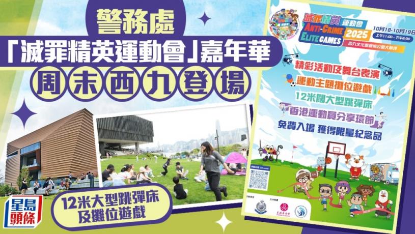 由香港警務處家庭衝突與性暴力政策組、毒品調查科、商業罪案調查科、網絡安全及科技罪案調查科以及財富情報及調查科合辦,「香港善德基金會」及「禁毒領袖學院」全力支持的「滅罪精英運動會」嘉年華,將於10月18日及19日在西九文化區藝術公園大草坪舉行,活動旨在教育市民識別及避免陷入騙局、洗黑錢及網絡陷阱,並傳達禁毒和兒童保護重要訊息。