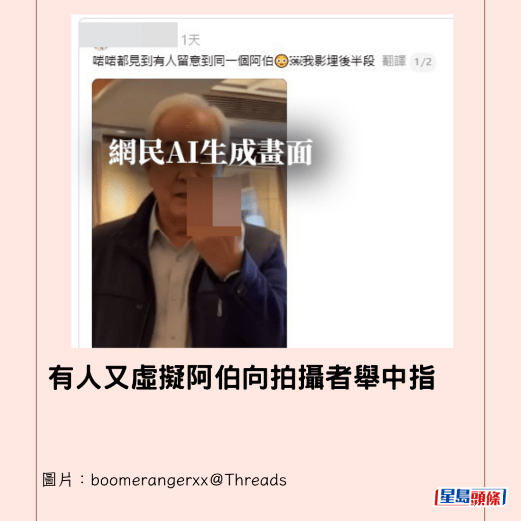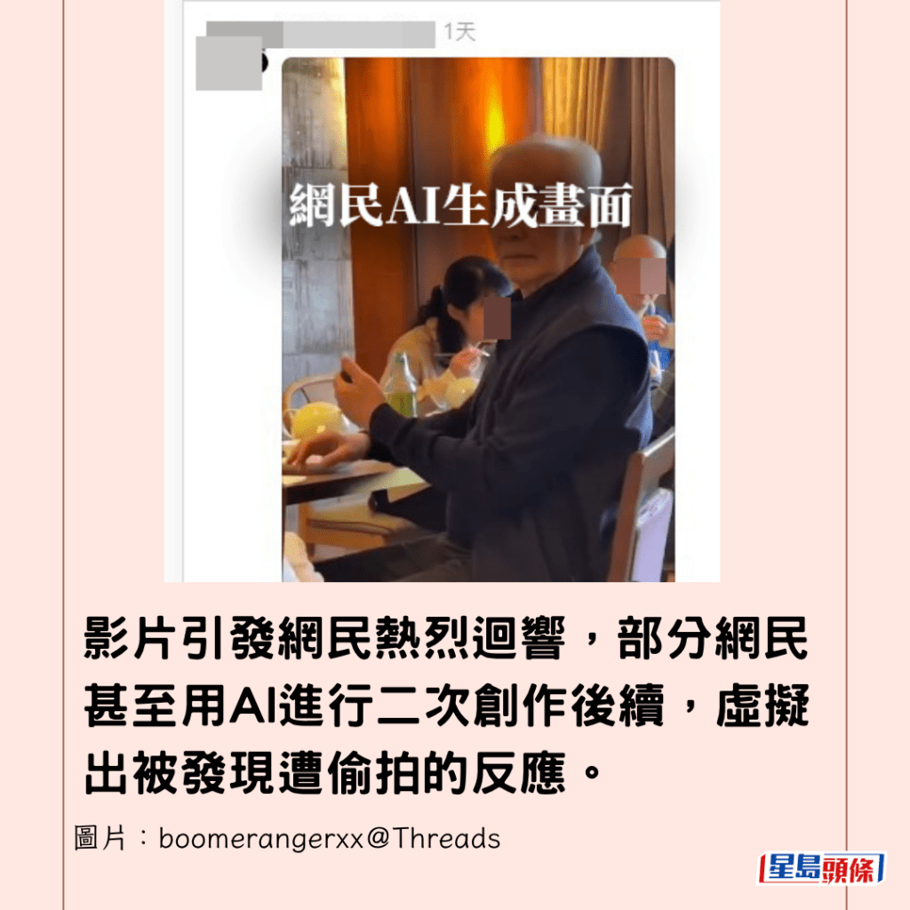 影片引發網民熱烈迴響,部分網民甚至用AI進行二次創作事件後續,虛擬出阿伯被發現遭偷拍的反應,有人虛擬阿伯起身除衫露出「老當益壯」的一身肌肉,有人又虛擬阿伯向拍攝者舉中指。