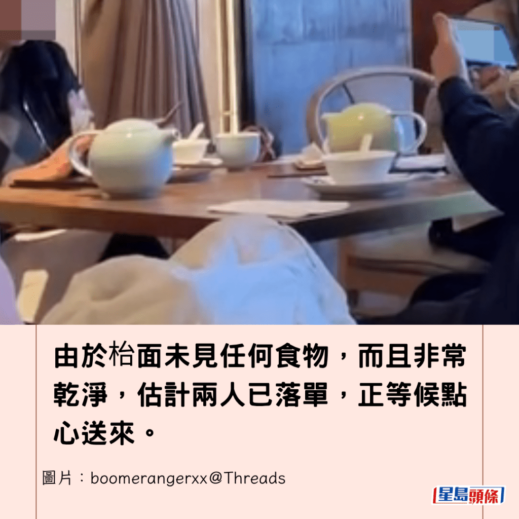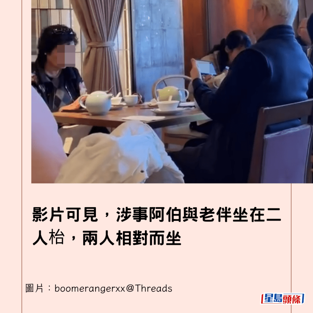 影片可見,涉事阿伯與老伴坐在二人枱,兩人相對而坐,由於枱面未見任何食物,而且非常乾淨,估計兩人已落單,正等候點心送來。