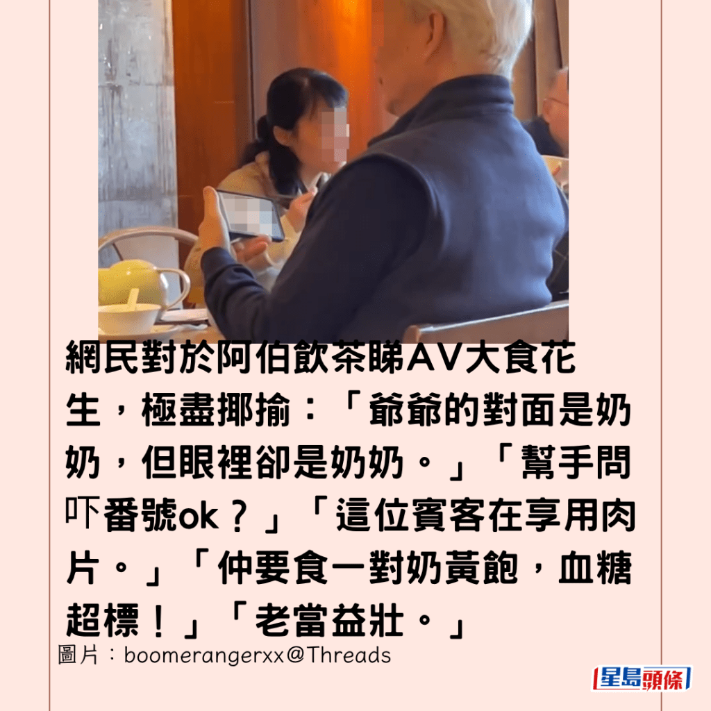 網民對於阿伯飲茶睇AV大食花生,極盡揶揄:「爺爺的對面是奶奶,但眼裡卻是奶奶。」「幫手問吓番號ok?」「這位賓客在享用肉片。」「仲要食一對奶黃飽,血糖超標!」「老當益壯。」