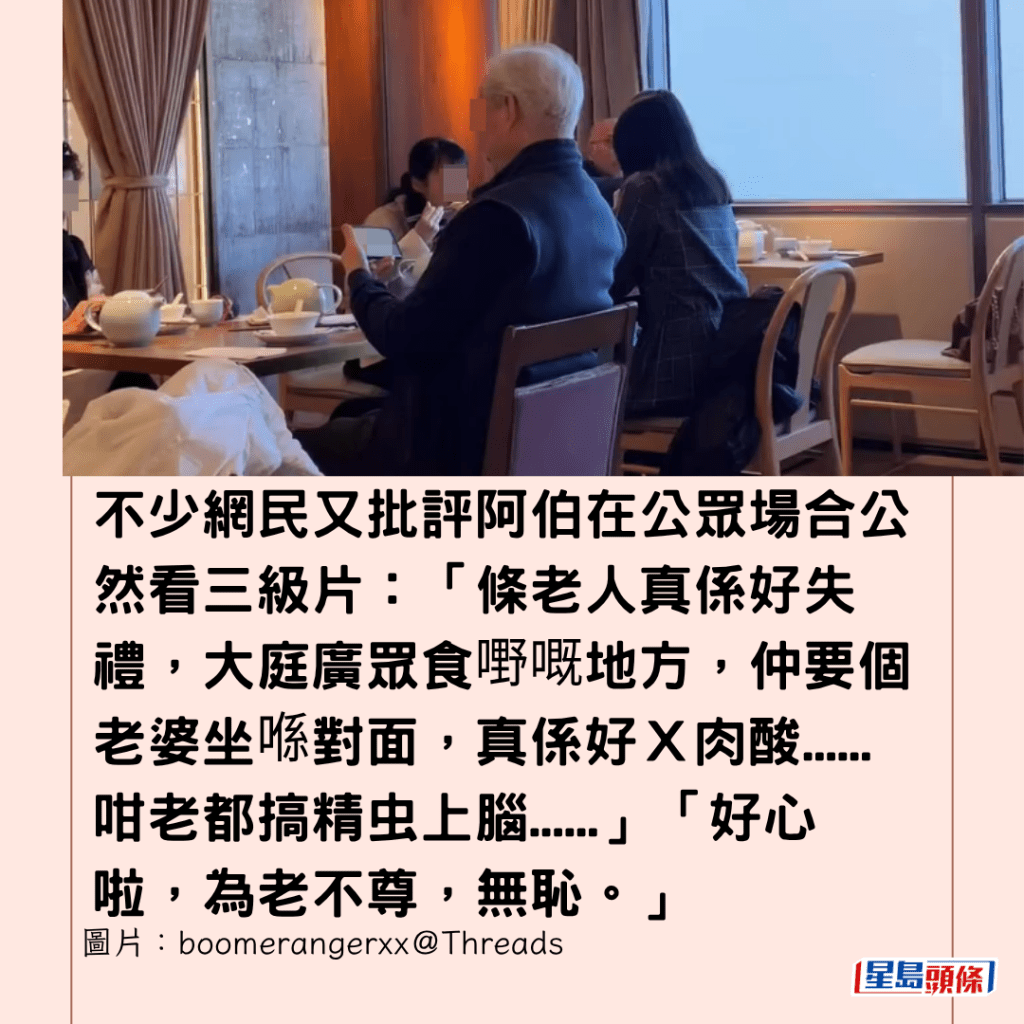 不少網民又批評阿伯在公眾場合公然看三級片:「條老人真係好失禮,大庭廣眾食嘢嘅地方,仲要個老婆坐喺對面,真係好X肉酸……咁老都搞精虫上腦……」「好心啦,為老不尊,無恥。」「癲……公眾地方一邊睇AV一邊同個老婆飲茶,呢個阿伯精蟲上腦。」「有d老人家都幾自我!」