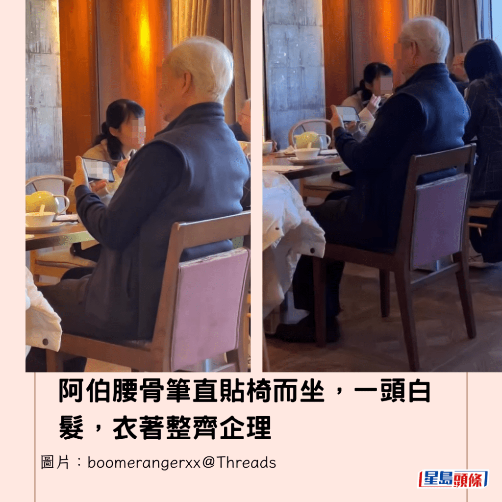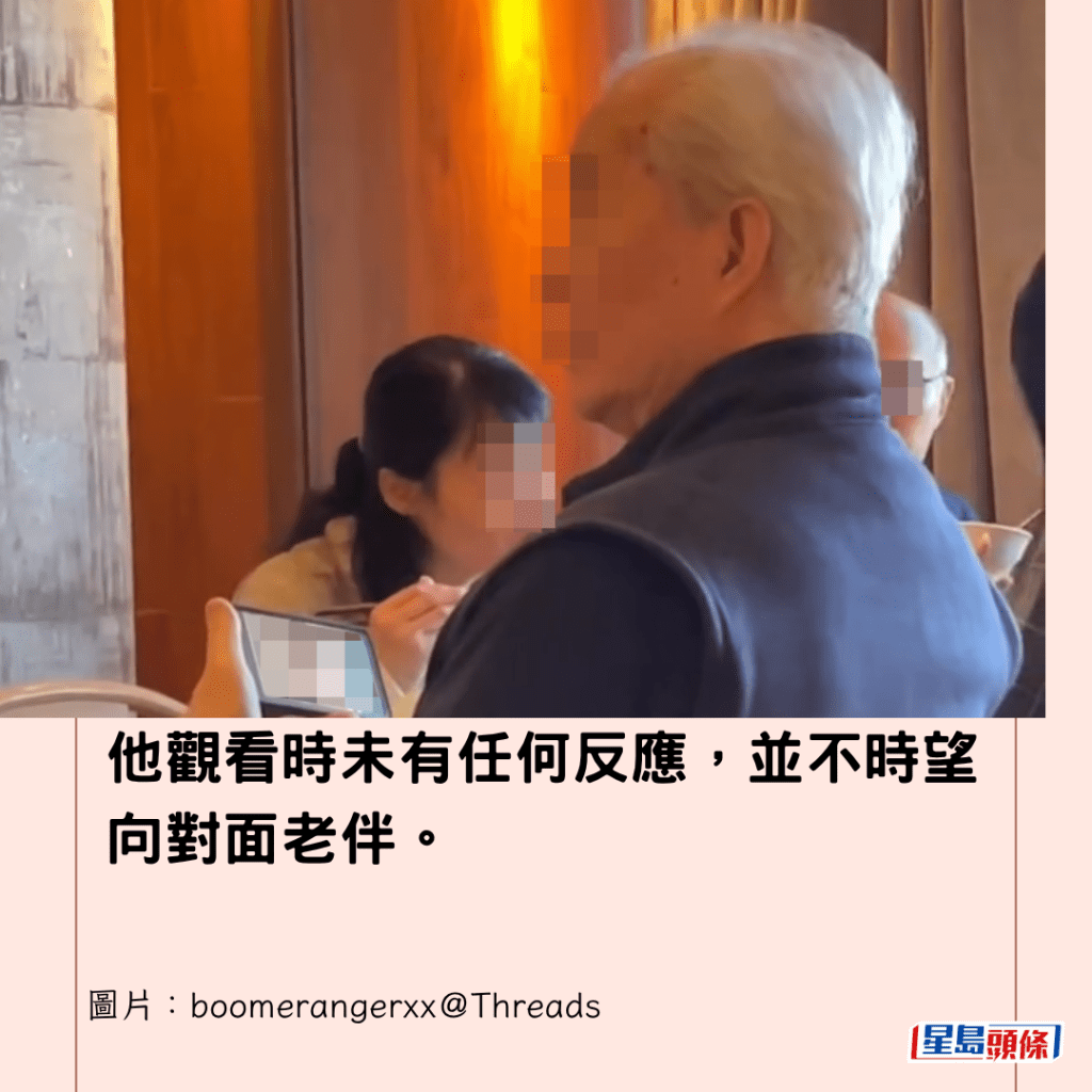 阿伯腰骨筆直貼椅而坐,一頭白髮,衣著整齊企理。他一副嚴肅模樣,高舉手機旁若無人地觀看,他觀看時未有任何反應,並不時望向對面老伴。