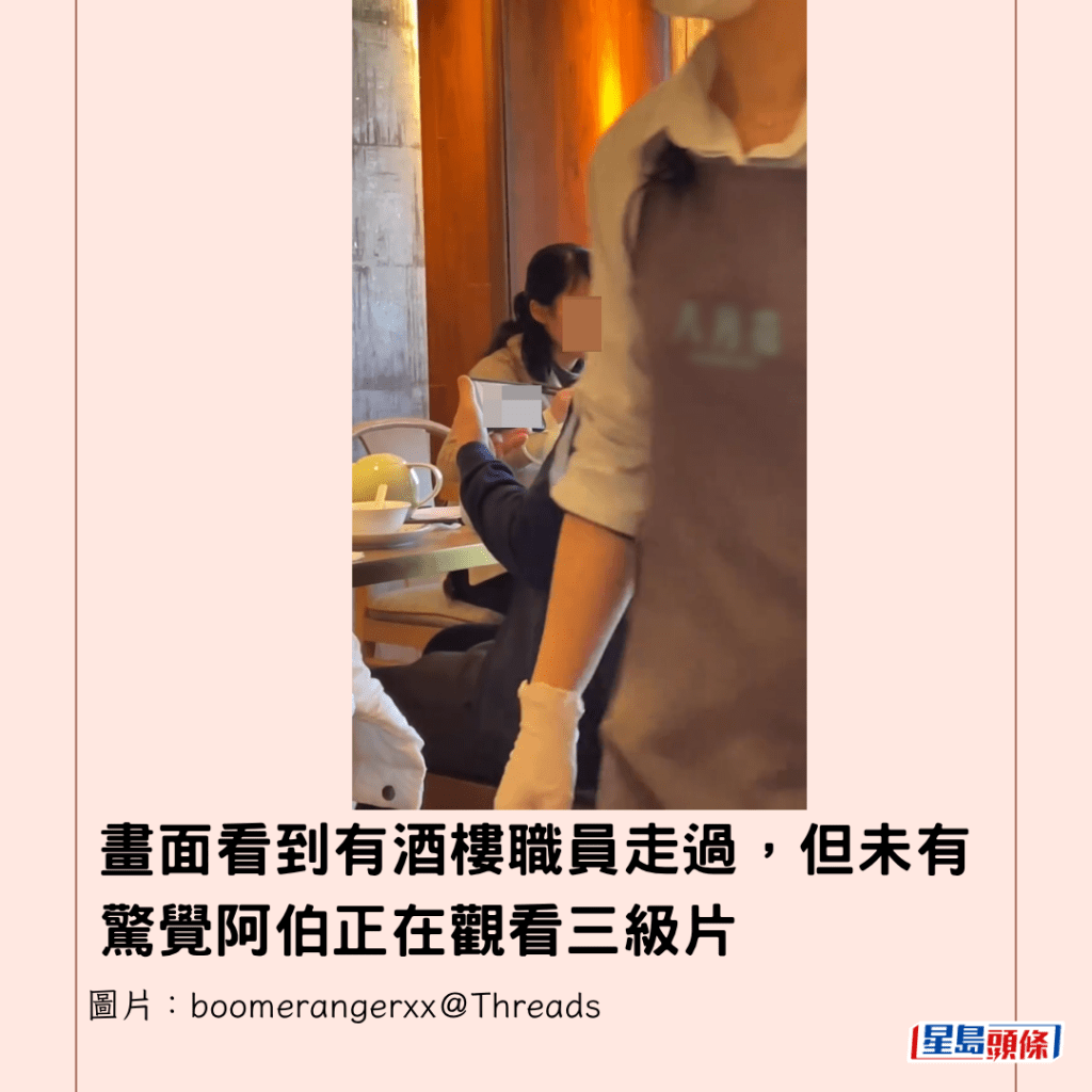 畫面看到有酒樓職員走過,但未有驚覺阿伯正在觀看三級片,而阿伯身旁女茶客亦專心談話,未有察覺。